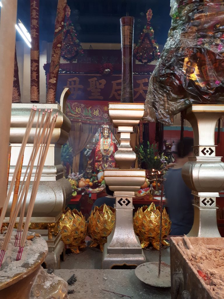 Près de Stanley Plaza, il y a le temple de Tin Hau. J’ai été très surprise de voir autant de divinités à l’intérieur. Quelques personnes faisaient des offrandes de fruits aux dieux.