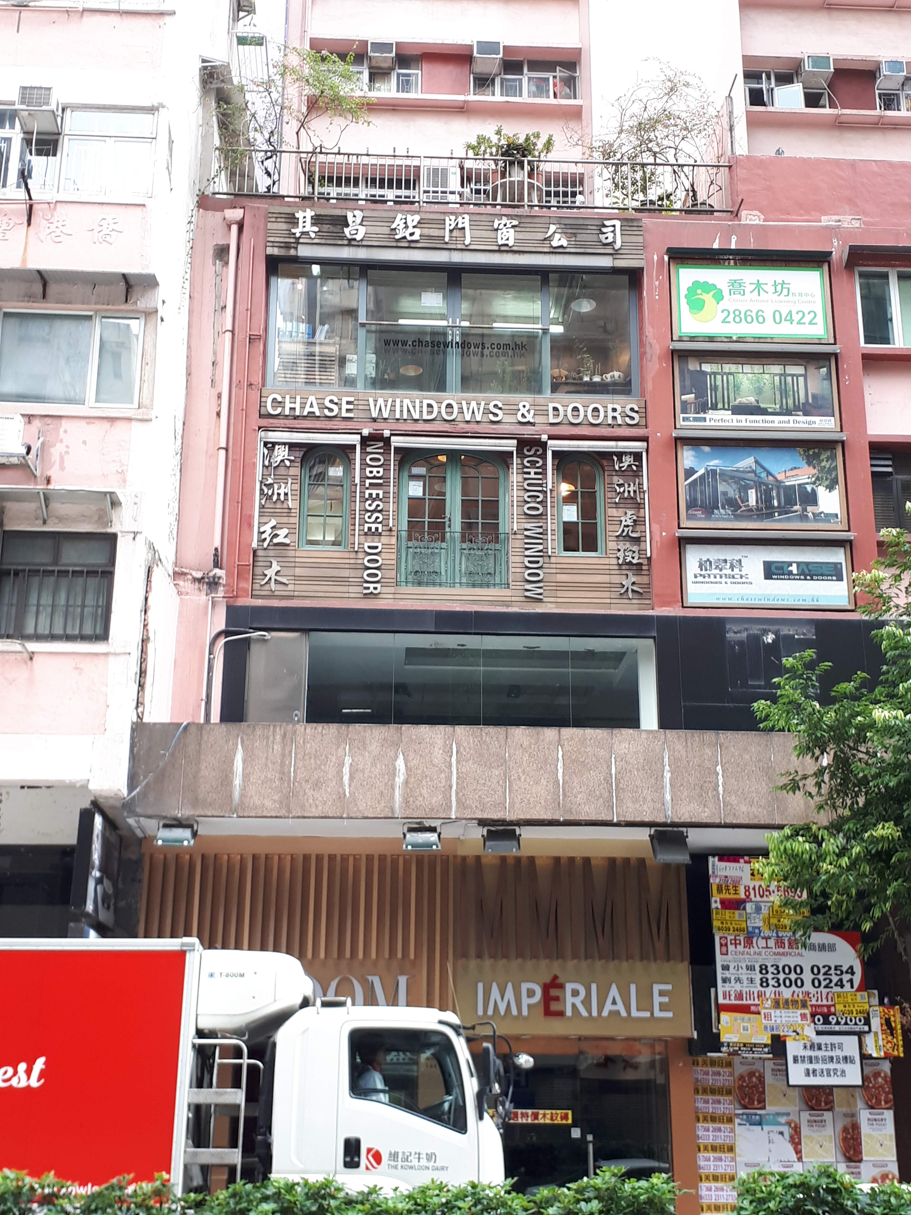 This windows shop actually displays their samples on the wall, which makes the building look funny! / Cette boutique qui vend des fenêtres a mis des exemples de produits sur le mur, ce qui donne un côté comique au building.